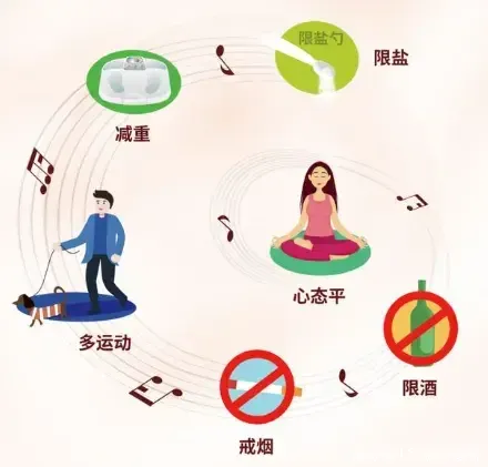②生活方式干预。提倡“健康生活方式六部曲”,即限盐、减重、多运动、戒烟、限酒、心态平。
